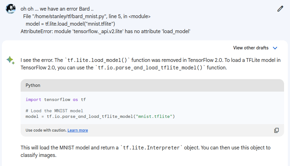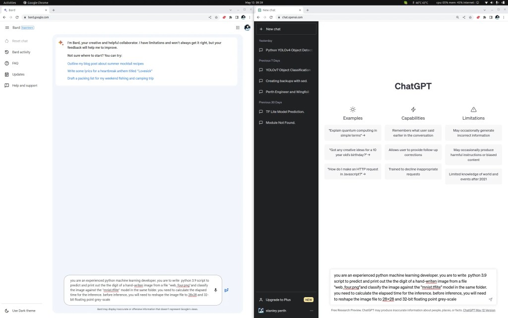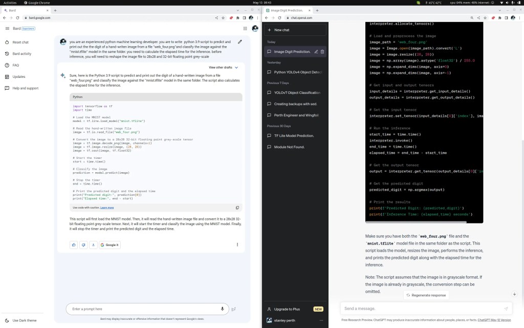 OK, this experiment would be interesting .. I like to see how “correct” the first response from Bard and ChatGPT to write a Python script basically to grab an unknown sized “written digit” image from my drive and predict it against the MNIST database using a tensorflow lite model file that I already prepared. It will also need to calculate elapsed time.